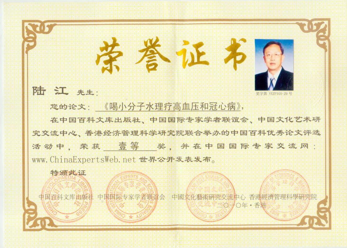 人類幾千年來患以上病癥需終生服藥,幾十年也不能治愈。可是我國南寧的高級工程師陸 江,于1990年想根治高血壓,研究發(fā)明了離子水瓶,處理出微小分子團水供飲用,經(jīng)過醫(yī)院臨床試用和專家鑒定,1999年獲中國發(fā)明專利權(quán),產(chǎn)品于2000年投放市場后一直跟蹤調(diào)查,據(jù)全國各地用戶反饋:祛除了高低血壓、糖尿病和冠心病,并使前列腺增生、咽喉炎、鼻竇炎、慢性氣管炎、支氣管炎、矽肺病、哮喘、慢性胃炎、腸炎、慢性膽囊炎、慢性腎炎、腎衰、膀胱炎、便秘、痔瘡、風濕性關(guān)節(jié)炎和濕疹皮炎及中風后遺癥等病癥不藥而愈。為什么喝微小水能治20多種病?陸 江從1991年德國科學(xué)家發(fā)現(xiàn)細胞膜水通道僅為2納米獲得啟發(fā),認為多種器官患病是因細胞脫水,不能正常代謝和分裂增殖,才使器官細胞減少致衰弱萎縮而形成細胞缺水性病癥。22年來的實踐有力地支持了“細胞脫水致病”這一重要論點,表明喝微小水可滿足細胞的生理需求,補水就能祛病,是生命科學(xué)新亮點。